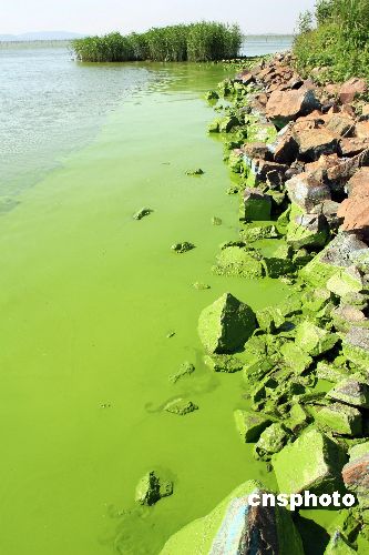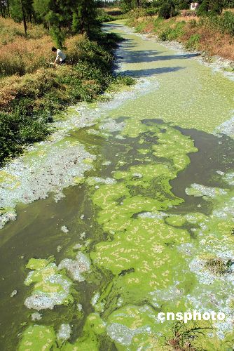 图为江苏省宜兴市周铁镇青店河的蓝藻,此处离太湖口大约700米。据当地群众反映,今年太湖蓝藻较往年大约提前了一个月,而且更为严重,已经出现了两次高潮,蓝藻使湖水、河水发臭、发浑。群众盼望“太湖美,美就美在太湖水”成为名副其实之言。中新社发 丁焕新 摄