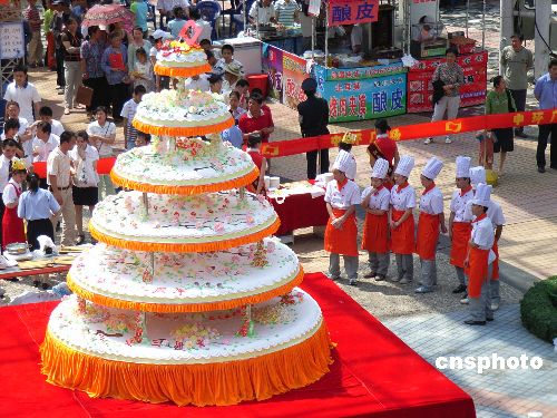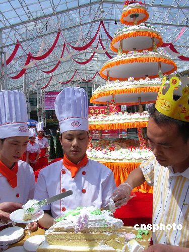 5月28日,齐齐哈尔市中环广场庆祝开业3周年,特制作了一个巨型蛋糕,直径3米,高4米,有6层,共用掉800公斤面粉,500公斤鸡蛋,200公斤奶油,总重量将近1600公斤,可供万人食用。喜庆的蛋糕供当日来广场的顾客免费享用,人们有序地排起了长队品尝蛋糕。中新社发 王云龙 摄