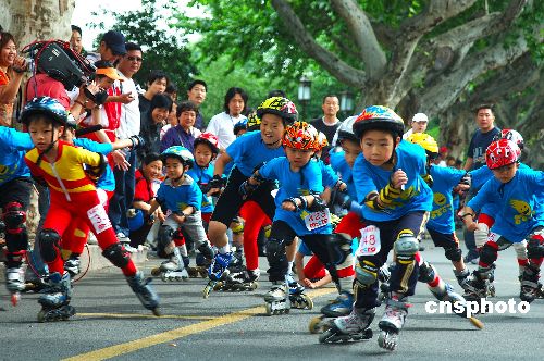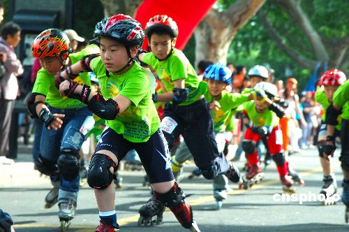 5月28日,“拥抱西湖·放飞梦想”第二届浙江省青少年环西湖公路轮滑大赛在西湖白堤举行。来自浙江省11个地市的400多名儿童参加了此次比赛。中新社发 引炜 摄