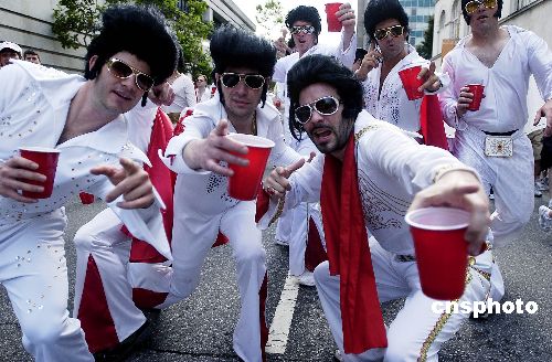 美国扮演著名歌手猫王的爱好者五月末欢聚旧金山,与来自世界各地猫王发烧友纵情欢乐。中新社发 陈钢 摄