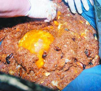 “我们预先花30分钟以电子蒸炉蒸熟糯米备用,洗刷处理和蒸熟咸鸭蛋后,即开始炒香鸡肉、栗子和香菇等主要材料。所有材料烹熟后,再用大木勺搅均材料。”