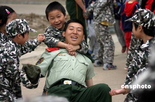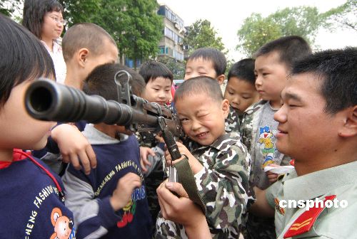 5月25日-28日,江苏省无锡市晨曦双语幼儿园200名小朋友在老师的带领下来到武警部队无锡某支队,与武警叔叔联欢,亲身“玩”枪械、叠被子、训练队列动作。据幼儿园负责人介绍,这项活动旨在培养孩子团结协作、吃苦耐劳的精神。中新社发 唐占军 摄
