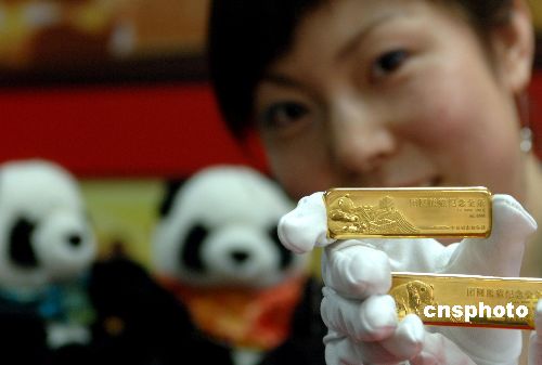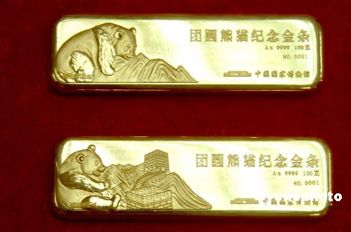 五月三十日,“团圆”金条正式亮相北京国家博物馆艺术品中心。该套金条由两支一百克的AU9999千足金条制作而成,其中一支正面精雕大熊猫“团团”,背景为绵延的万里长城;另一支为“圆圆”,背景为台湾秀美的阿里山。据悉,“团圆”金条将在大陆和台湾同步限量发行一千套。中新社发 韩艺冰 摄