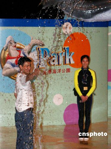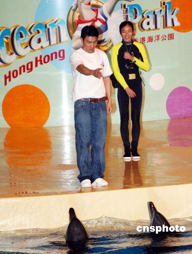 30日晚,香港明星、海洋公园保育基金保育大使刘德华为海洋公园保育基金筹募经费,与海豚一同演出海洋剧场show,刘德华与海豚有多年的合作,感情深厚,表演时默契十足。中新社发 蔡蔓莉 摄