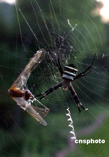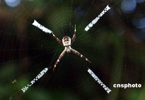 2006年5月30日,在地处四川达州宣汉普光镇P4-2井山坡上,发现一只背面酷似“人面”怪异蜘蛛在网上“写英文字母”,令人称奇。一些字母呈带状均匀分布在蜘蛛足部周围,很像英文中N、W、M、Y等字母的连写。中新社发 仝江 摄