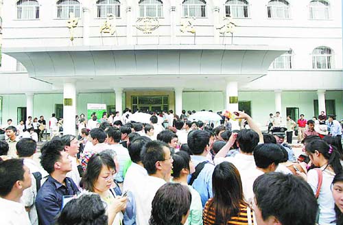 记者一看,若是这时来办手续,自己的确晚了。营业大厅此时已经挤满了人,门口拉起了警戒线,不少人堵在院子里,像一大堆马蜂挤在那里,根本看不出哪是队尾。大家都拿着装好资料的牛皮纸袋,各自打着手机正在找关系,不少人干脆铺起报纸坐在地上准备打“持久战”。