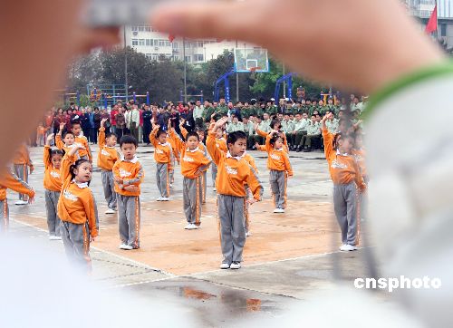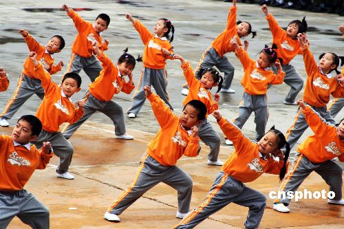 5月31日,北京总参通信部幼儿园的小朋友以少林功夫表演庆祝“六·一”儿童节的到来。中新社发 宋清源 摄