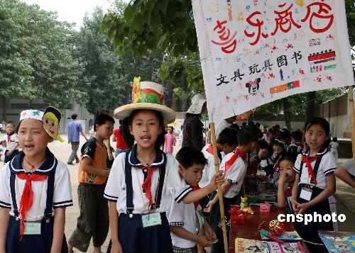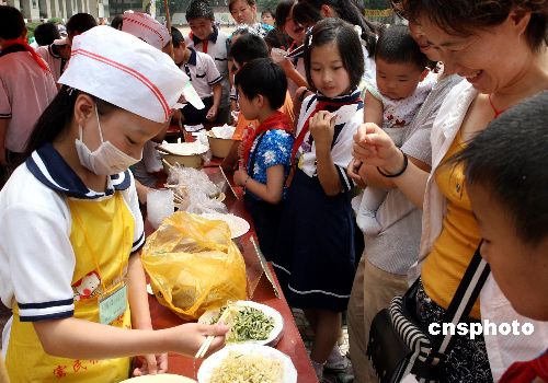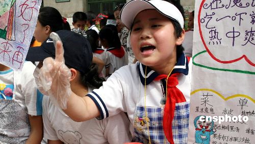 5月31日,西安市新城区韩森寨小学的“小厨师”在“好吃一条街上”招揽顾客。当日,“六一”儿童节前,西安市新城区韩森寨小学开展了“小市场大舞台”体验活动,千余小学生在校园内自办跳蚤市场、好吃一条街、游乐园等,使学生在实践中体验,在体验中成长,提高自我管理和组织能力,从中感悟劳动的艰辛。中新社发 侯 智 摄