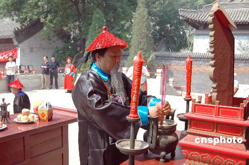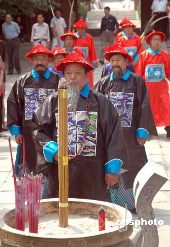 6月1日,身着清制服饰的工作人员正在天津文庙祭奠孔子。当天上午,天津举行纪念文庙建庙570周年祭奠活动。天津文庙是现存规模最宏大、保存最完整的明清建筑群,也是天津最早的学宫,现为青少年爱国主义教育基地。文庙以她深厚的文化积淀,已经成为天津设卫筑城600年的历史见证和天津文化品位的标志。中新社发 苏振强 摄