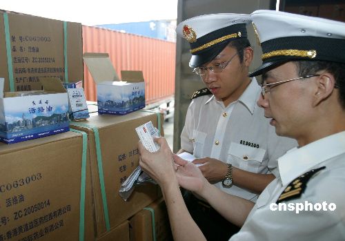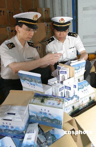 日前,广州某医药保健品进出口有限公司向广州海关驻新风办事处申报进口“黄道益”牌活络油一批,经现场海关关员审核,发现该公司进口货物存在侵犯知识产权风险。经查,该批活络油数量有十万瓶之多,申报价值达一百八十多万元港币,是近年来全国海关在进口环节查获涉嫌侵权货物数量最多、案值最大的一宗案件。中新社发 陈国华 摄
