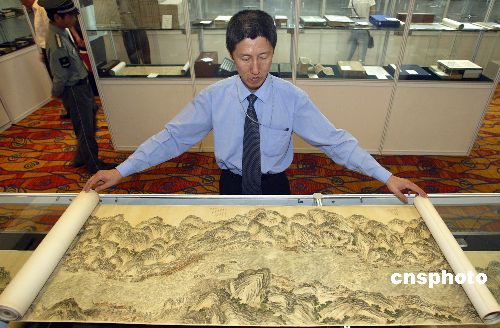 6月2日,迄今为止发现的最长的中国古代地图《金沙江全图》亮相北京嘉里中心饭店。该地图将在3日举行的“中国嘉德2006春季拍卖会”古籍善本专场中被拍卖。这幅地图为清乾隆初年的官绘,全长74米。该地图是清中期大规模金沙江疏治工程图,不仅为进一步认识清代西南地区的自然风貌提供了珍贵史料,而且,此图的绘制和呈进也成为促成金沙江大规模疏治工程的前提条件。中新社发 张炜 摄