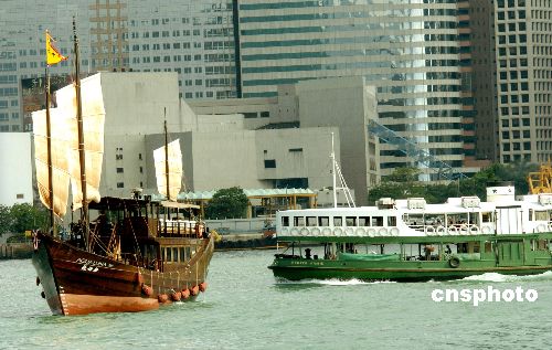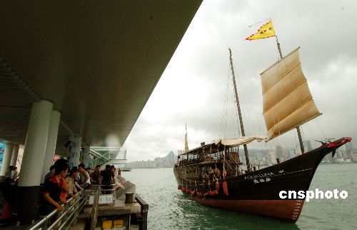 一艘名为“张保仔”仿古帆船穿梭维港,为周末维港增添景色。张保仔是十九世纪时香港海域一名海盗,随从达4万人,船只也有600只之多。至今,民间传说长洲南部洞穴是张保仔藏宝之地。中新社发 洪少葵 摄