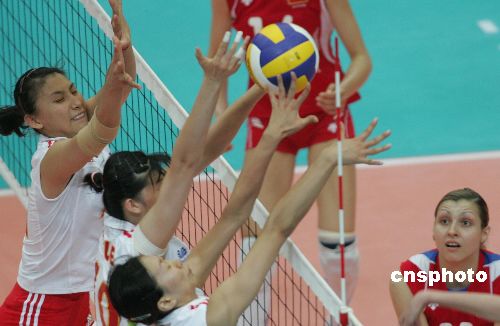 六月三日晚,中国女排在北京航空航天大学体育馆举行的二零零六年中国国际女排精英赛北京站比赛中迎战最后一个对手俄罗斯队。此前,中国队分别以三比零、三比一战胜荷兰队和古巴队。截至发稿时止,中国队以一比一与对手打平。中新社发 武仲林 摄