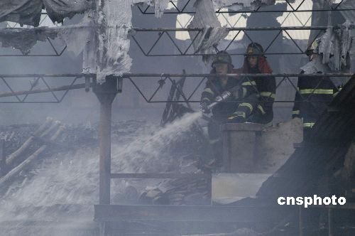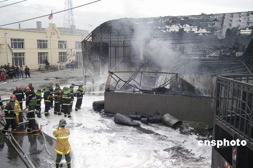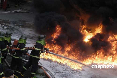 6月3日17时9分,位于黑龙江省哈尔滨市道外区东直桥下望江桥街24号的一处工厂突发大火,厂房内装有甲苯等化学物质的油漆桶发生爆炸,燃烧的气体气味难闻,化工、南岗、道外、太平、承德四个消防中队的消防队员奋不顾身,经过3个多小时的扑救,控制了火势,但大火将200多平方米的厂房烧的面目全非。目前具体原因有关部门正在调查中。中新社发 肖劲彪 摄
