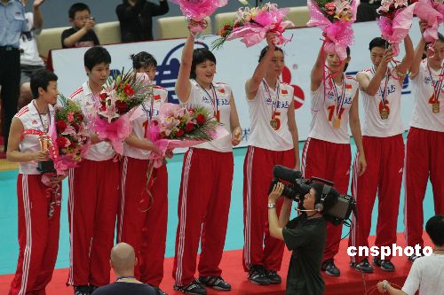 六月三日晚,中国女排在北京航空航天大学体育馆举行的二零零六年中国国际女排精英赛北京站比赛中以三比二战胜俄罗斯队,夺得冠军。中新社发 武仲林 摄