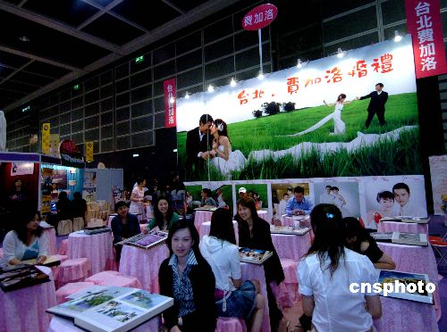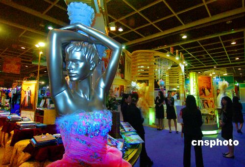 今年夏季这个最大型的婚纱商展上﹐港台婚纱名店云集﹐展厅里推出时尚婚纱﹑婚庆用品﹑珠宝首饰﹑中西礼品及婚庆﹑婚宴﹑婚纱策划﹑摄影等服务项目﹐期间还举办国际足球明星坐阵的世界杯婚纱﹑婚姻监礼坐谈会﹑名模婚纱大会演﹑创造完美新娘等活动﹐商展为期三天﹐周日圆满落下帏幕。中新社发 宋吉河 摄