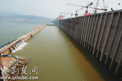 在大坝右岸坝顶,三峡总公司总经理李永安指着爆破示意图介绍说,右岸RCC围堰的爆破拆除量为18.6万立方米,因技术难度高、爆破强度大而被称为“天下第一爆”。随着三峡大坝全线建成,为三峡蓄水、通航和施工期发电立下汗马功劳的三峡工程三期围堰,将功成身退。(李先宏 李剑军 唐晓安)