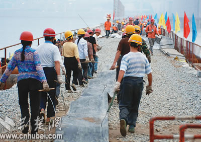 中新网6月5日电 据湖北日报报道,6日下午4时,人称“天下第一爆”的三峡大坝右岸上游RCC围堰将准时起爆。围堰“功成身退”后,全长2309米的三峡大坝将全线挡水。目前,有关爆破的各项准备工作已进入倒计时。