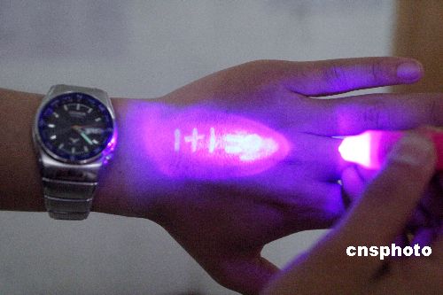 2006年6月,随着中考、高考临近,一种在纸上、手上或桌子上写字,用肉眼看不出来的“作弊笔”近期在济南市悄然出现。据悉,这种笔从外观看和普通的笔几乎没什么区别,但笔芯采用特殊材料做成,在纸张上或手上写后无色透明,但在笔帽的荧光灯照射下所写内容清晰可见。中新社发 龚辉 摄