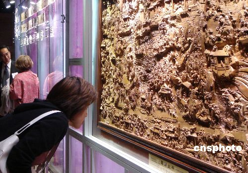 当地时间六月五日,中国教会圣经事工展在纽约的圣约翰主教座堂展出,这次主题为“脚前的灯,路上的光”的展览将持续到本月十二日。大多数展品是第一次在中国大陆之外展出,图为描述耶稣一生的大型木雕吸引参观者。中新社发 谭宏伟 摄