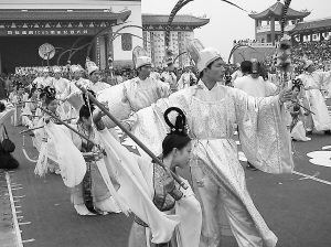 隆重庄严的湄洲妈祖祭典则与陕西省黄陵县的黄帝陵祭典、山东省曲阜市的祭孔大典并称为“中华三大祭典”,祭典由主祭一人、与祭若干人、司仪、司香、读祝文等各一人主持,还有司钟、司鼓、司乐、司僚等执事;祭典在鸣炮、鸣钟、奏乐中开始,主祭、与祭等各就各位,虔诚地上香、行三跪九叩大礼,接着行“初献礼”,行“亚献礼”,行“终献礼”,最后“焚祝文、焚宝帛”,在香烟缭绕、钟鼓齐鸣、炮声震天中礼成。祭典乐舞是围绕三献为中心,分迎神、初献、亚献、终献、送神五个乐章,三献乐称海平、和平、咸平,由男女歌生合唱。舞备八佾,由男女舞生64名组成,分别秉羽和执龠,为古代最高规格之文舞,达到祭礼与艺术观赏的完美结合。 (陈建平)
