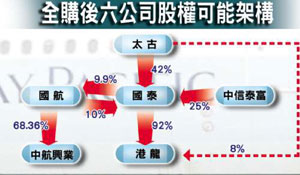 社评称,若国泰购入港龙,将来两家公司的飞机均可以从内地主要城市延飞欧美,运载内地输欧美货品。这不仅对两家航空公司的发展意义重大,而且对保持和巩固香港的物流中心和航空枢纽地位具关键性影响。另一方面,内地三大航空公司正集中精力发展内地航线,无暇外顾。向香港开放第五航权,有利于内地贸易出口和旅游行业的发展。内地航空业通过与香港航空公司合作,亦有利提升企业管治水平,增强竞争力,加快与国际接轨。可见,理顺国泰、国航与港龙的股权结构与竞争关系,不仅对所涉及的六家上市公司可形成多赢关系,对两地航空业更可形成双赢局面。