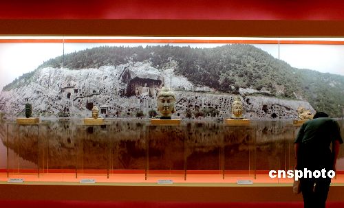 六月初正在北京举办的《文化遗产日特别展览——国家重点文物征集成果》上,一名观众观看洛阳龙门石窟失而复得的佛头。据了解,中国政府于2002年起正式启动国家重点文物征集专项资金,每年拨付5000万元用于征集流失海外的珍品文物。到目前为止,已经实际花费约2亿元人民币,204件中华瑰宝得以回归故土。据联合国教科文组织的统计,目前在47个国家的200多家博物馆中,有中国文物167万件。而散落在海外民间的中国文物,更是数倍甚至十数倍于此。中新社发 韩艺冰 摄