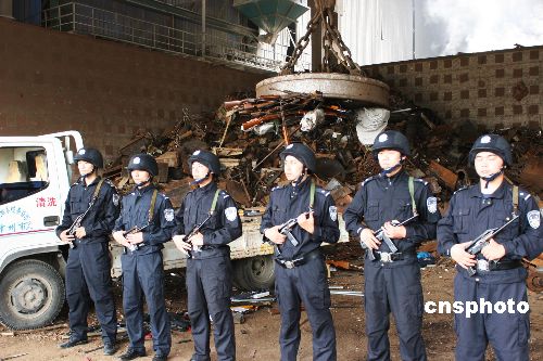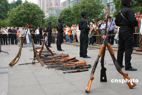6月6日上午,江苏常州市公安局集中销毁一批在打黑除恶行动中收缴的非法枪支和管制刀具。据警方统计,全市共收缴各类非法枪支217支、子弹41000余发,以及仿真枪623支、管制刀具4300余件、雷管21枚等违禁物品,坚决打击了涉枪涉爆违法犯罪活动。中新社发 李建军 摄