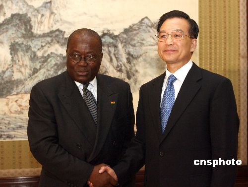 六月六日,中国国务院总理温家宝在北京会见加纳共和国外交部长纳纳·丹夸·阿库福-阿多。中新社发 廖文静 摄