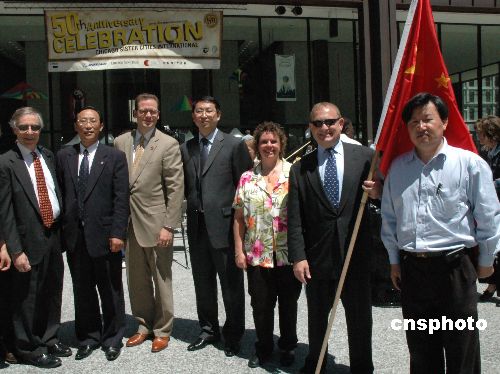 | 美国当地时间六月五日中午,二十五个国家的五百多名嘉宾聚集在芝加哥市的戴利广场, 热烈庆祝美国国际姐妹城市项目开展五十周年,同时, 为期一周的芝加哥国际姐妹城市节也于当天揭开帷幕。美国国际姐妹城市项目始于1956年;1985年, 芝加哥先后与中国上海市和沈阳市结成了姐妹城市。图为芝加哥国际姐妹城市项目主席罗伯特·卡尔(左三)、项目中国委员会主席威廉·斯潘赛(左一)和正在芝加哥访问的沈阳市对外经济贸易局负责人钱乃生(左二)、关志鹏(右四)、芝加哥广州协会会长胡大江(右一)等在开幕式上合影。中新社发 张大卫 摄