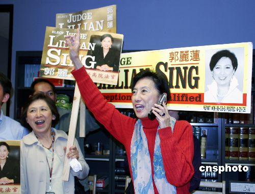 当地时间六月六日,美国旧金山高等法院举行法官选举,华裔资深法官郭丽莲以绝对优势获胜。图为郭丽莲在其竞选总部接听从选务局传来的喜讯。中新社发 刘丹 摄