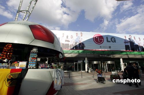 当地时间六月七日,在世界杯即将开赛前,慕尼黑机场外满目是足球形状的世界杯吉祥物、纪念品销售商店以及巨幅的世界杯宣传画,营造出浓浓的世界杯大赛的气氛。中新社发 盛佳鹏 摄