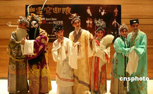 上海昆剧团的主要演员六月八日在台北的记者会上集体亮相,上海昆剧团将于本月十四日开始在台北市城市舞台连演五场,为宝岛观众奉献《司马相如》、《劈山救母》等经典昆剧折子戏。中新社发 曾嘉 摄