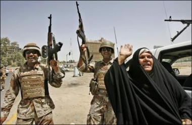 中新网6月8日电 据法新社报道,2006年6月8日,伊拉克政府举行发布会,在发布会上伊拉克总理宣布扎卡维被击毙。图为伊拉克妇女庆祝扎卡维被击毙。(春风)
