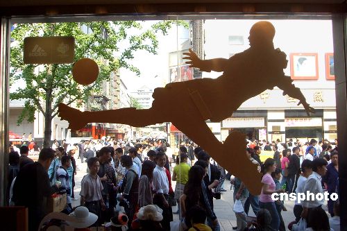 6月8日,随着德国世界杯足球赛的临近,北京街头与足球有关的广告也越来越多地冲击着人们的眼球。中新社发 玉龙 摄