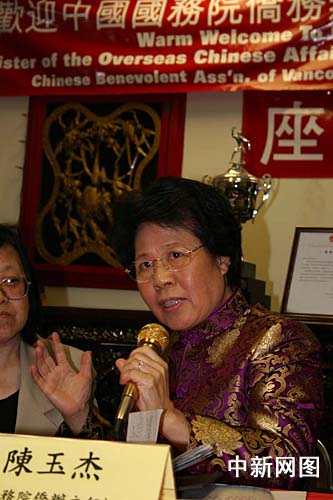 国侨办主任陈玉杰在位于唐人街中心的温哥华中华会馆内与侨领座谈。