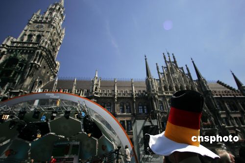 德国球迷在慕尼黑马林广场前等待开幕式开始。