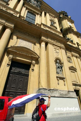 哥斯达黎加球迷身披国旗走过慕尼黑著名的国王广场。