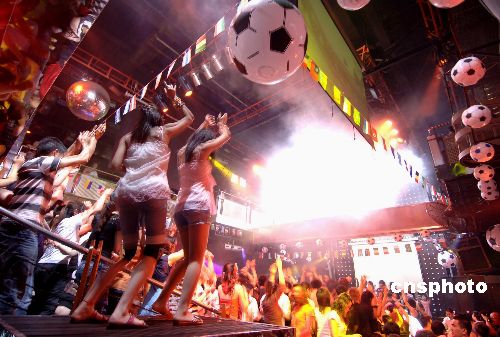 北京时间六月十日凌晨,福州“世界杯宝贝”在球迷酒吧里亮相,庆祝2006德国世界杯打响。中新社发 王东明 摄