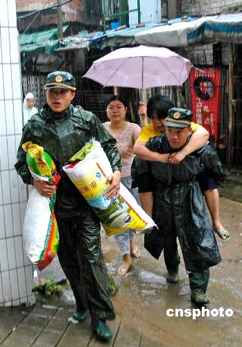 六月九日,广西梧州市,武警官兵把灾民从危险地段转移至民政部门安置点。六月八日凌晨,梧州市遭受近四十年来最大的暴雨袭击,暴雨引起山体滑坡,造成十二人死亡十人受伤,该市动用武警部队紧急转移一万三千五百多名受灾市民。中新社发 何鎏 摄