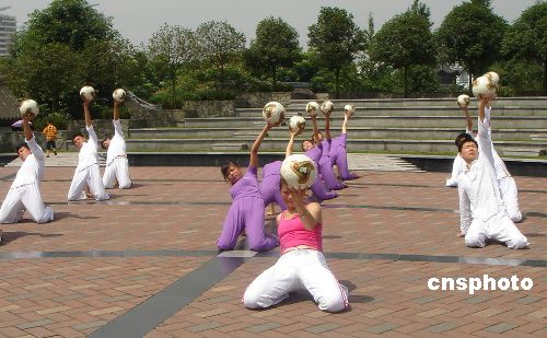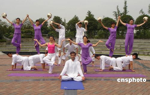 在德国世界杯进行之际,一种帮助球迷在欣赏球赛之后恢复体能的全新健身方式--“足球瑜伽”于6月10日出现在成都。图为专业瑜伽教练在展示“足球瑜伽”的魅力。中新社发 杨杰 摄