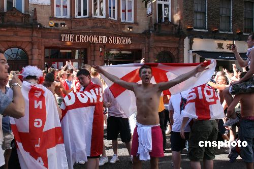 六月十日,英格兰队在世界杯首次亮相,一比零小胜巴拉圭队,英国球迷在伦敦街头狂欢庆祝胜利。图为比赛结束后,一群球迷在唐人街附近的酒吧外又唱有跳。