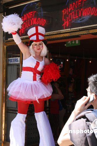 六月十日,英格兰队在世界杯首次亮相,一比零小胜巴拉圭队,英国球迷在伦敦街头狂欢庆祝胜利。图为伦敦一酒吧女招待,脚踩高跷在街边请球迷入内看球。