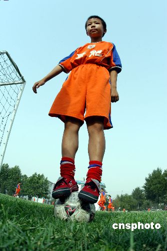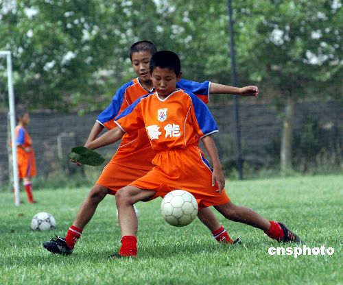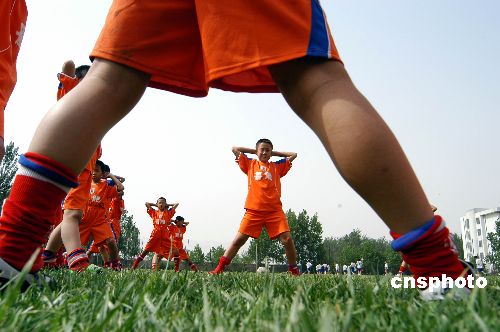 2006年6月9日,正值2006德国足球世界杯比赛期间,一群来自全国各地的10—12岁的小球员在山东鲁能泰山足球学校的绿茵场上训练。坐落在山东潍坊的山东鲁能泰山足球学校,目前有足球少年千余名。他们来自全国22个省市(自治区),经过训练,他们可先进入U11至U19七个年龄段的梯队,然后进入各个级别的国家队,最终成为国字号球员。2014年或者2018年,有望在世界杯绿茵场上见到他们。 中新社发 王志德 摄