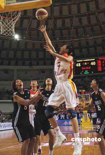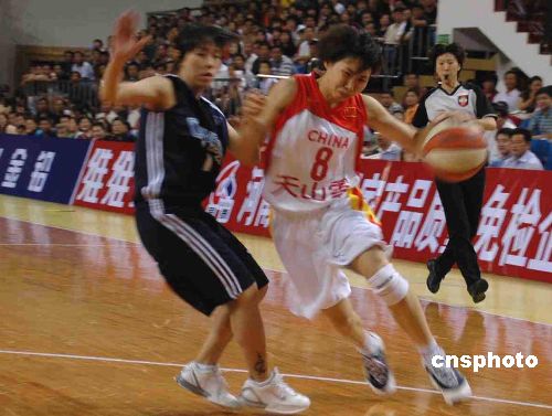 六月十一日晚,二OO六年海峡两岸女篮邀请赛在河南济源拉开帷幕。两队均以最强阵容出战,最终,中国国家女篮以七十七比六十战胜中国台北女篮,其中国家女篮有四人得分上两位数。中新社发 胡珂 摄