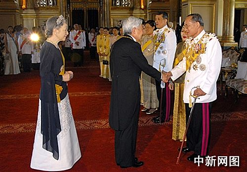 普密蓬国王率领全体王室成员,十二日下午在王宫里欢迎各国王室代表的到来。在引领下,应邀到访的各国王室代表包括国王、王后、王储、王子、公主等,相继与普密蓬国王及其他泰国王室成员握手、寒暄,表达他们最美好的祝愿。