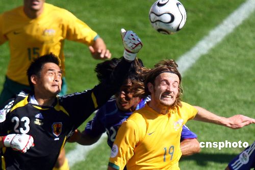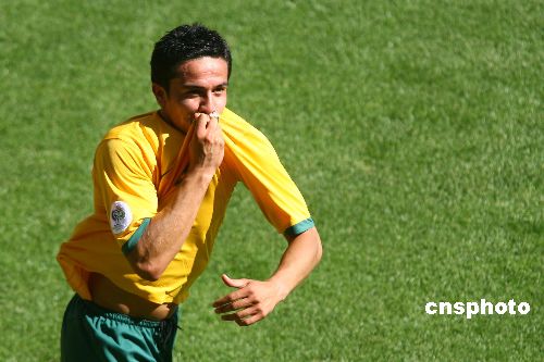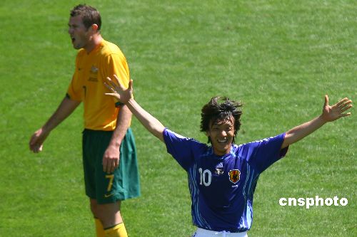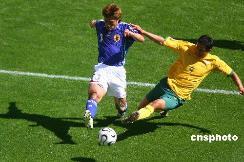 德国凯泽斯劳滕当地时间六月十二日,在凯泽斯劳滕弗里茨-瓦尔特球场开始的世界杯F组首轮第一场比赛中,澳大利亚三比一逆转击败日本。上半时,澳大利亚门将施瓦泽将中村俊辅的长传漏进门内,下半时,希丁克连续换上三名进攻球员,在终场前十分钟内,替补中场卡希尔连进两球将比分反超,最后时刻另一位替补十五号阿洛伊西再添一分。中新社发 盛佳鹏 摄