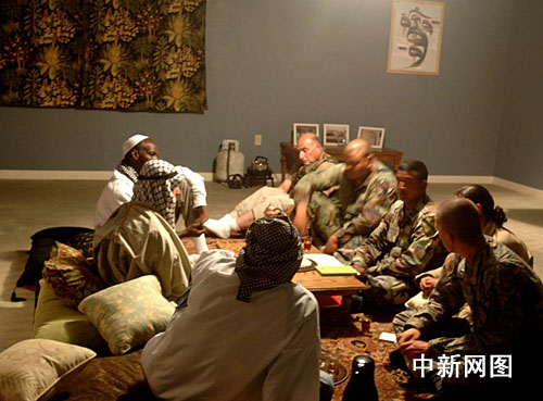 建筑里张挂着伊拉克国旗,四面像摄影棚一般悄然分布有多间阿拉伯民居客厅,美军男女官兵脱鞋盘腿坐在地毯上,面对面与两位伊拉克人交谈,还有一名翻译在旁边。