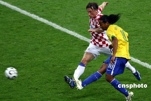 德国柏林当地时间六月十三日,世界杯小组赛F组的比赛在柏林奥林匹克体育场进行,巴西队凭借卡卡的一粒进球赢得比赛胜利,克罗地亚队几次没能把握住进球的机会,最终落败。中新社发 盛佳鹏 摄