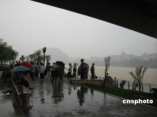 六月十三日至十四日,广西柳州连降暴雨,二十四小时内降雨量达七十毫米,十四日上午十一时柳江水位达七十八点六一米,距警戒水位四米,目前仍以每小时六厘米的速度增长。目前该市航运、铁路、陆路交通运输正常,居民生活尚未受影响。中新社发 欧惠兰 蒙鸣明 摄